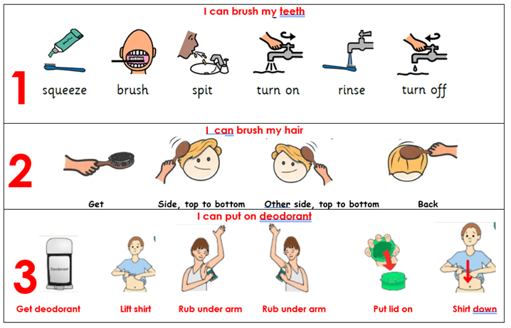 If you believe that your child would benefit from the use of a schedule at home, please talk to their classroom teacher about your needs. Recently the following schedule was provided to a family to assist with their child’s morning routine.